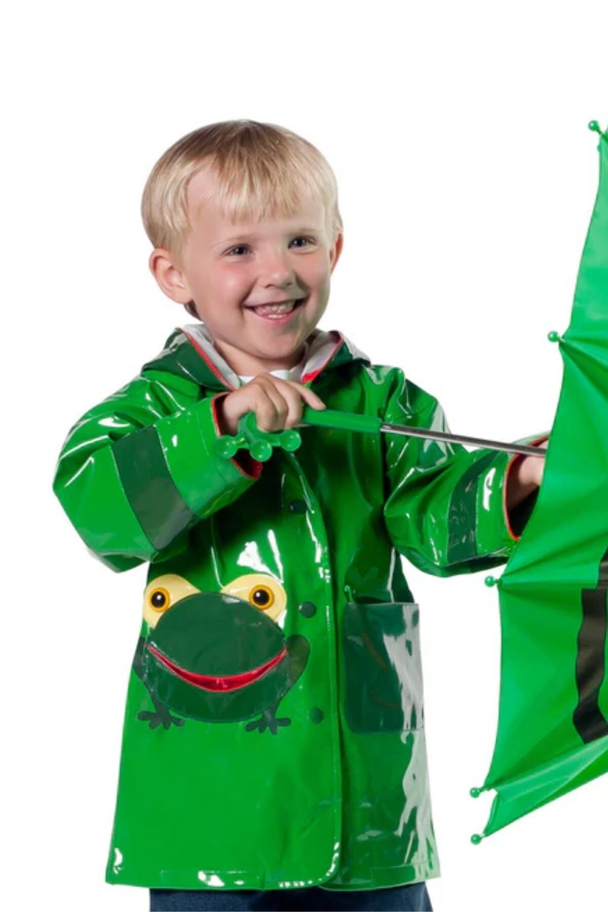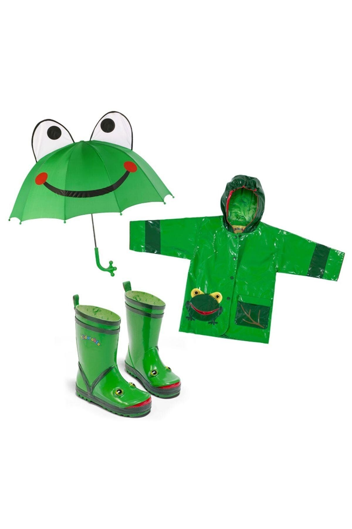 Kidorable Kurbağa yağmur çizmesi ve şemsiyesi ile yağmurluğu tamamlayabilirsiniz.