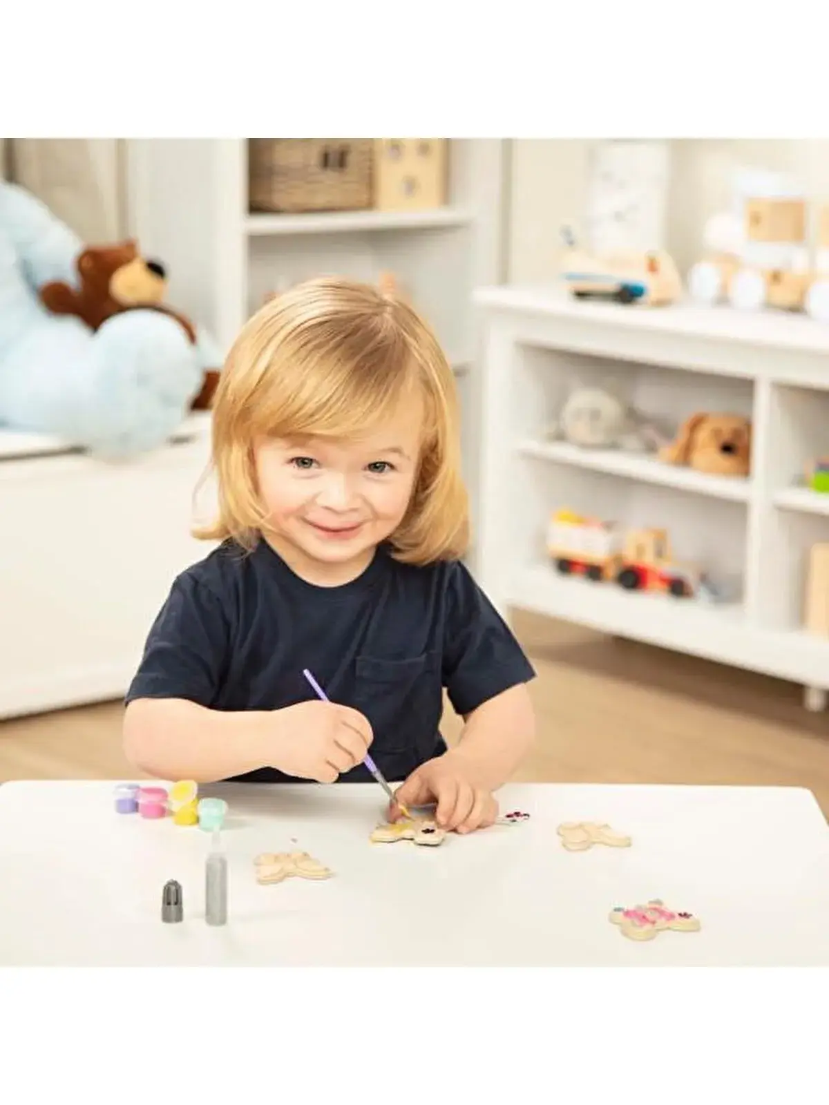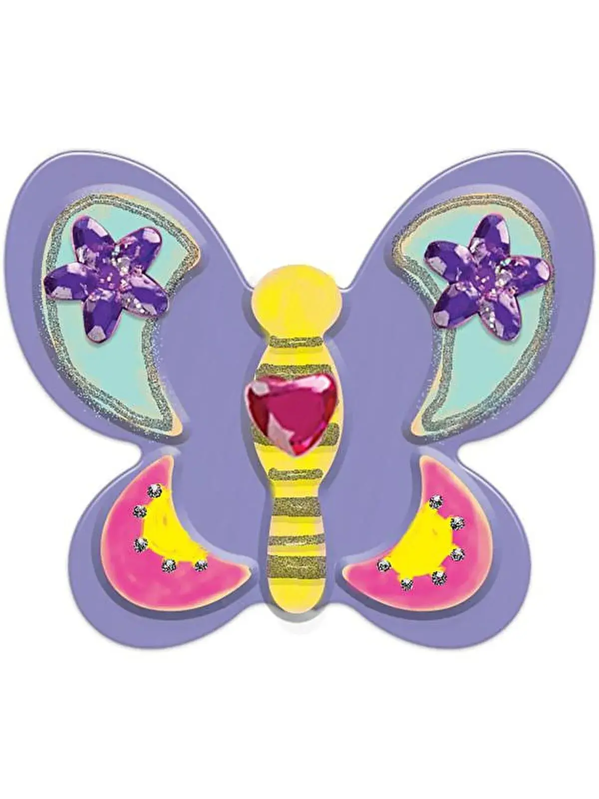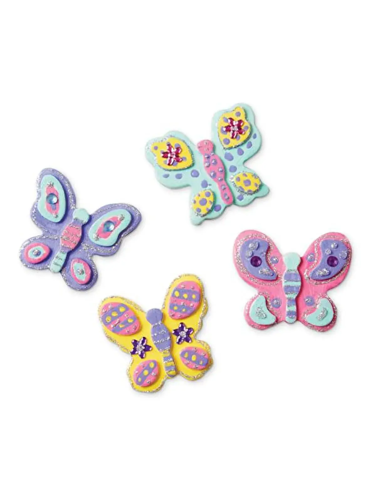 Bu set 4 adet farklı tasarımlarda üç boyutlu ahşap kelebek magneti, dört renk boya, fırça, mücevher stickerlar, ve sim boya tüpü içerir.