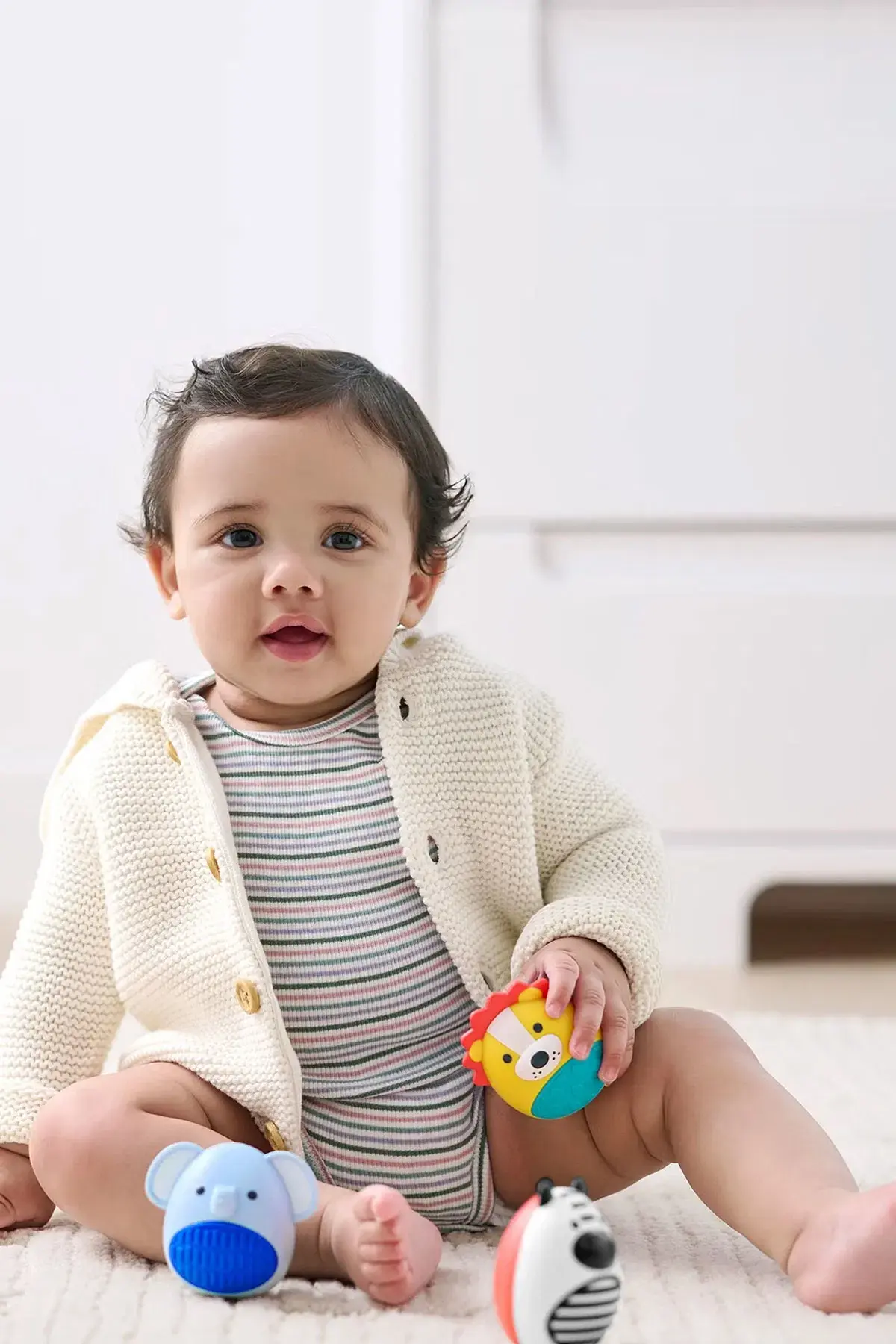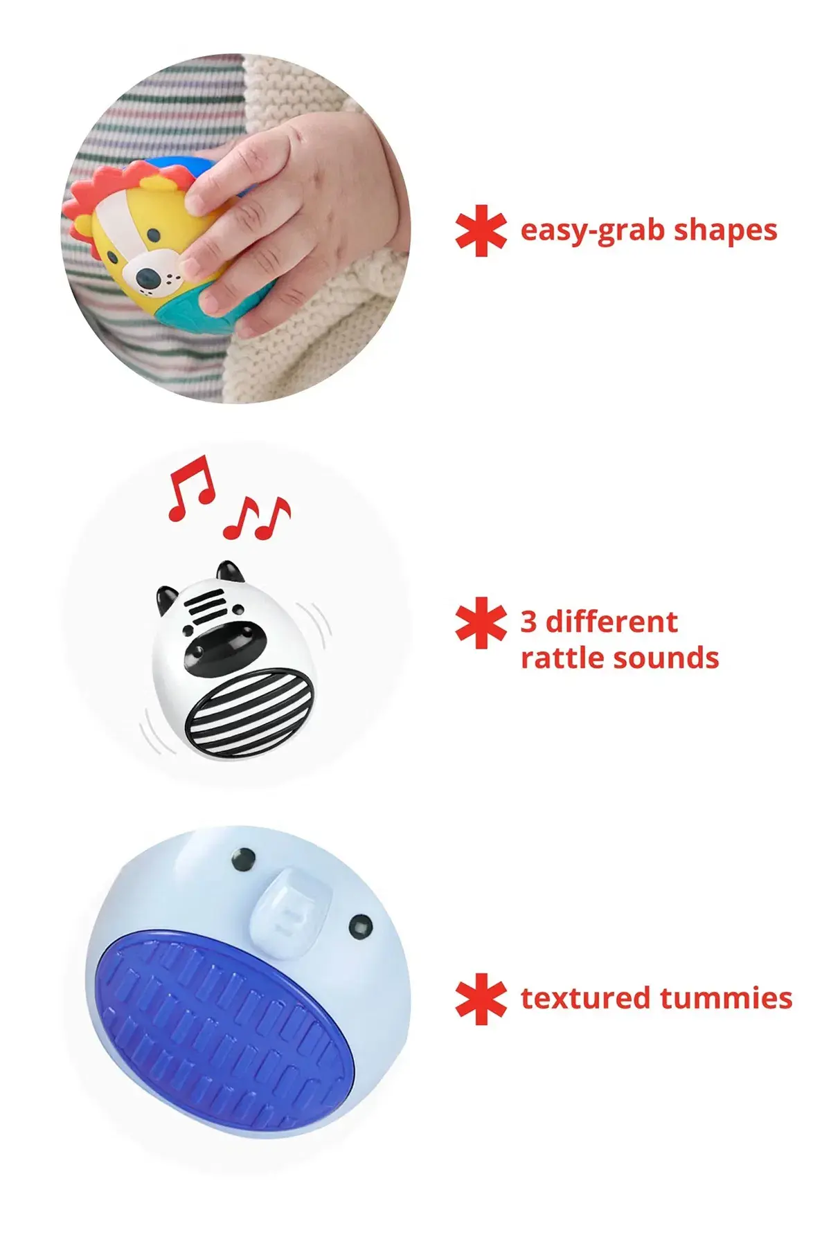 Oyun zamanını renklendirin ve biraz müzik yapın! Sevimli safari hayvanları ve kolay tutulabilen şekillerle tasarlanmış bu şirin çıngırak seti, bebeğinizi üç farklı ses, dokunsal dokular ve daha fazlasıyla keşfetmeye teşvik eder.Özellikleri: